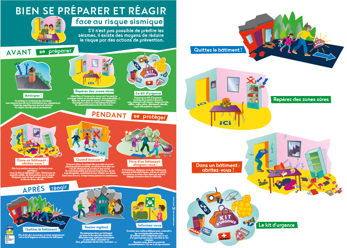 Création d’un dépliant et d’une affiche sur la prévention liée aux risques sismiques. Création des illustrations