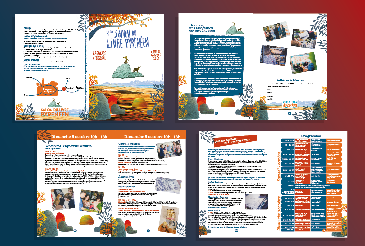 Création des programmes de 24 pages des salons 2023 et 2024 à partir des affiches et des illustrations des artistes Seb Cazes et Sellina Guiné