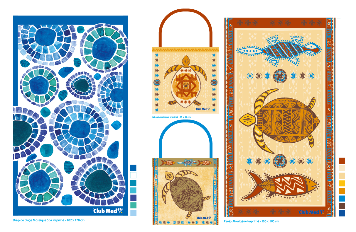 Création des illustrations pour des draps de bain pour le Club Méditerranée. Vendus chez Carré Blanc